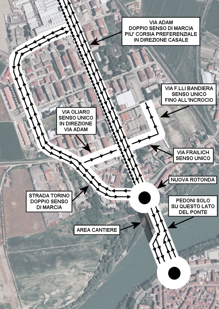 Entrerà in vigore domenica 29 febbraio prossimo la nuova viabilità sul Ponte sul fiume Po a Casale Monferrato. verrà aperta al transito la carreggiata del ponte attualmente chiusa e il cantiere verrà spostato sull’altra carreggiata: la nuova viabilità è stata impostata al fine di garantire la canalizzazione del traffico di attraversamento lungo via Adam e l’utilizzo prevalente della Strada Vecchia Torino per il traffico a servizio del quartiere. Per permettere una viabilità più scorrevole verrà realizzata una nuova rotonda all’incrocio fra via Adam, strada Vecchia Torino, strada Vecchia Vercelli e il ponte sul fiume. Via Adam sarà percorribile nei due sensi di marcia e sarà mantenuta la corsia ‘preferenziale’ per autobus, taxi e mezzi di emergenza in direzione della città. Il transito pedonale è spostato sul lato destro del ponte percorrendolo in direzione Oltreponte. Vengono istituiti nuovi sensi unici in via Oliaro (verso via Adam), in via Frailich (verso via F.lli Bandiera) e in via F.lli Bandiera (da via Frailich fino all’incrocio con via De Cristoforis). Vengono istituiti nuovi divieti di svolta a sinistra in uscita dalla città per quanto riguarda via Oliaro, via Olearo, via Piacibello, via dei Mille e via Camurati. L’accesso alle vie poste a sinistra di via Adam dovrà avvenire preferibilmente da strada Vecchia Torino oppure utilizzando i seguenti percorsi: a) via Frailich - via F.lli Bandiera – via De Cristoforis b) via De Cristoforis – via F.lli Bandiera – via Cabiati “Giunge ad una svolta importante un’opera complessa come l’allungamento del Ponte – dichiara l’Assessore ai Lavori Pubblici Ettore Coppo – il lavoro sul ponte di valle è completato ed inizia la fase finale che prevede l’allungamento del ponte di monte. Stiamo recuperando sui tempi programmati e se non ci saranno imprevisti contiamo di rispettare il termine dei lavori per la fine di giugno. La sicurezza del nostro territorio e della città migliorerà sensibilmente perché avremo eliminato la strozzatura del fiume in corrispondenza del ponte. La nuova viabilità del ponte potrebbe creare qualche comprensibile disagio, ma ricordiamo ai cittadini che è ancora in vigore fino al 30 giugno prossimo la convenzione con la Società Autostrade che permette di usufruire del 70% di riduzione sul pedaggio del tratto Casale Nord – Casale Sud e viceversa”.